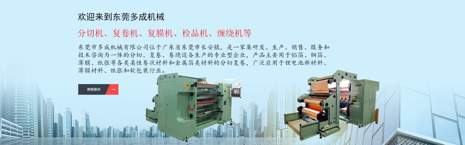 東莞市多成機(jī)械有限公司位于廣東省東莞市長安鎮(zhèn),是一家集研發(fā)、生產(chǎn)、銷售、服務(wù)和技術(shù)咨詢?yōu)橐惑w的分切、復(fù)卷、卷繞設(shè)備生產(chǎn)的專業(yè)型企業(yè),產(chǎn)品主要用于鋁箔、銅箔、薄膜、紙張等各類柔性卷狀材料和金屬箔類材料的分切復(fù)卷,廣泛應(yīng)用于鋰電池新材料、薄膜材料、紙張和軟包裝行業(yè),產(chǎn)品范圍有分切機(jī)、復(fù)卷機(jī)、復(fù)膜機(jī)、檢品機(jī)、纏繞機(jī)等,是國內(nèi)外分切卷繞設(shè)備專業(yè)供應(yīng)商。